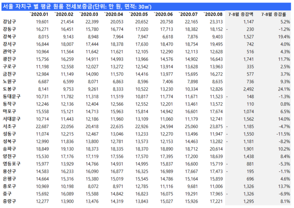 서울 25개구 전체의 원룸 평균 전세보증금은 8월 평균 1억6246만원으로 조사됐다. 전달 대비 약 2.1%(321만원) 올랐다. 8월 원룸 전월세 거래량은 총 1만4183건으로 전달 대비 21.2% 줄었는데, 전세보증금은 거래량 감소 속에서도 지난 1월부터 7개월 연속 상승했다. 다방은 "집주인의 불안 심리가 전세가 상승으로 이어지고 있다"고 했다.