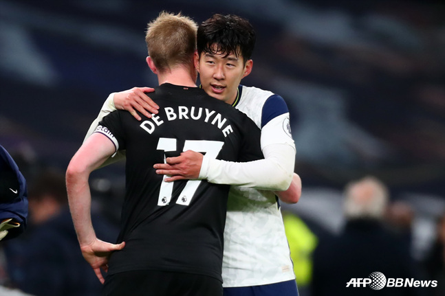 | 케빈 데 브라이너(검은색 유니폼)와 손흥민. /사진=AFPBBNews=뉴스1 |