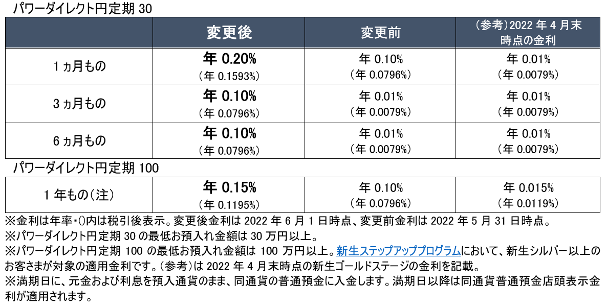 当行は、2022年5月13日に公表した中期経営計画「新生銀行グループの中期ビジョン(以下、「中期ビジョン」)」に掲げる『顧客中心主義の徹底』を実践し、お客さまの立場に立ったサービスの提供を積極的に推進いたします。その一環として、2022年6月1日より、個人のお客さまを対象とした円・外貨の定期預金金利を大幅に引き上げます。