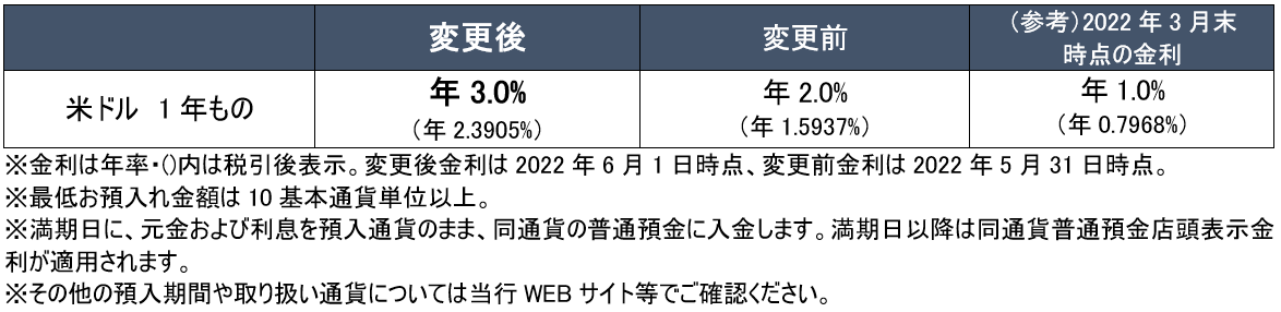 今般の引き上げにより、円定期預金は1ヵ月もので年0.20%(税引前)と変更前の2倍、2022年4月末時点の金利(年0.01%)からは20倍の水準となります。また外貨定期預金は、米ドル1年もので業界最高水準(*)となる年3.0%(税引前)の金利をご提供します。なお、新規に口座を開設するお客さまは、2022年5月に金利を引き上げた「スタートアップ円定期預金」にて、3カ月もの円定期預金を年1.0%(税引後金利年0.7968%)でご利用いただけます。
