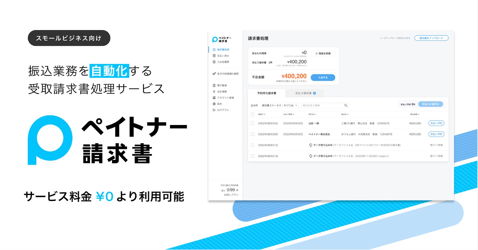 「スモールビジネスにやさしい支払い・請求で新しい挑戦を後押しする」というミッションのもと、オンライン型ファクタリングサービス「ペイトナー ファクタリング(旧先払い)」、フリーランスでも発行可能な「Paytner Card(ペイトナーカード)」を提供しています。2022年9月に請求書の管理、振込まですべて自動化する「ペイトナー 請求書」をリリース。ビジネスに取り組むすべての人たちのお金に関する課題を解決するプラットフォームの構築に向けたサービス展開を目指します。