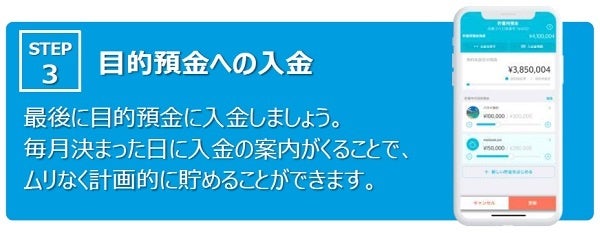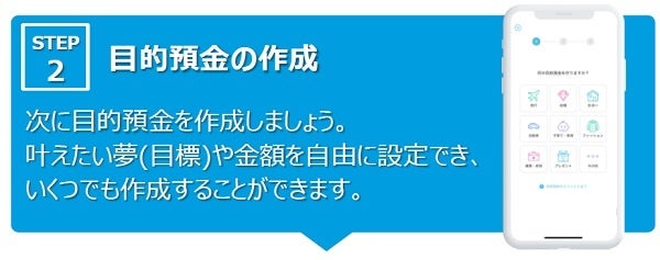 ■「Wallet+」は利用者の方々の夢の実現を応援するアプリです。「目的預金」では叶えたい夢や目標ごとに目標金額などを設定しそれぞれ管理することで、夢への距離が一目でわかります。